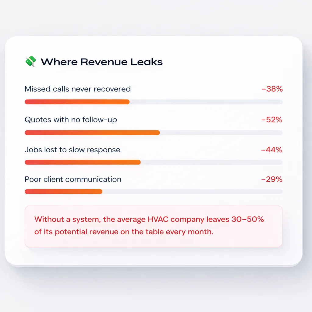 A complete operational system for commercial HVAC companies designed to reduce admin workload, improve response times, and increase quote conversions.